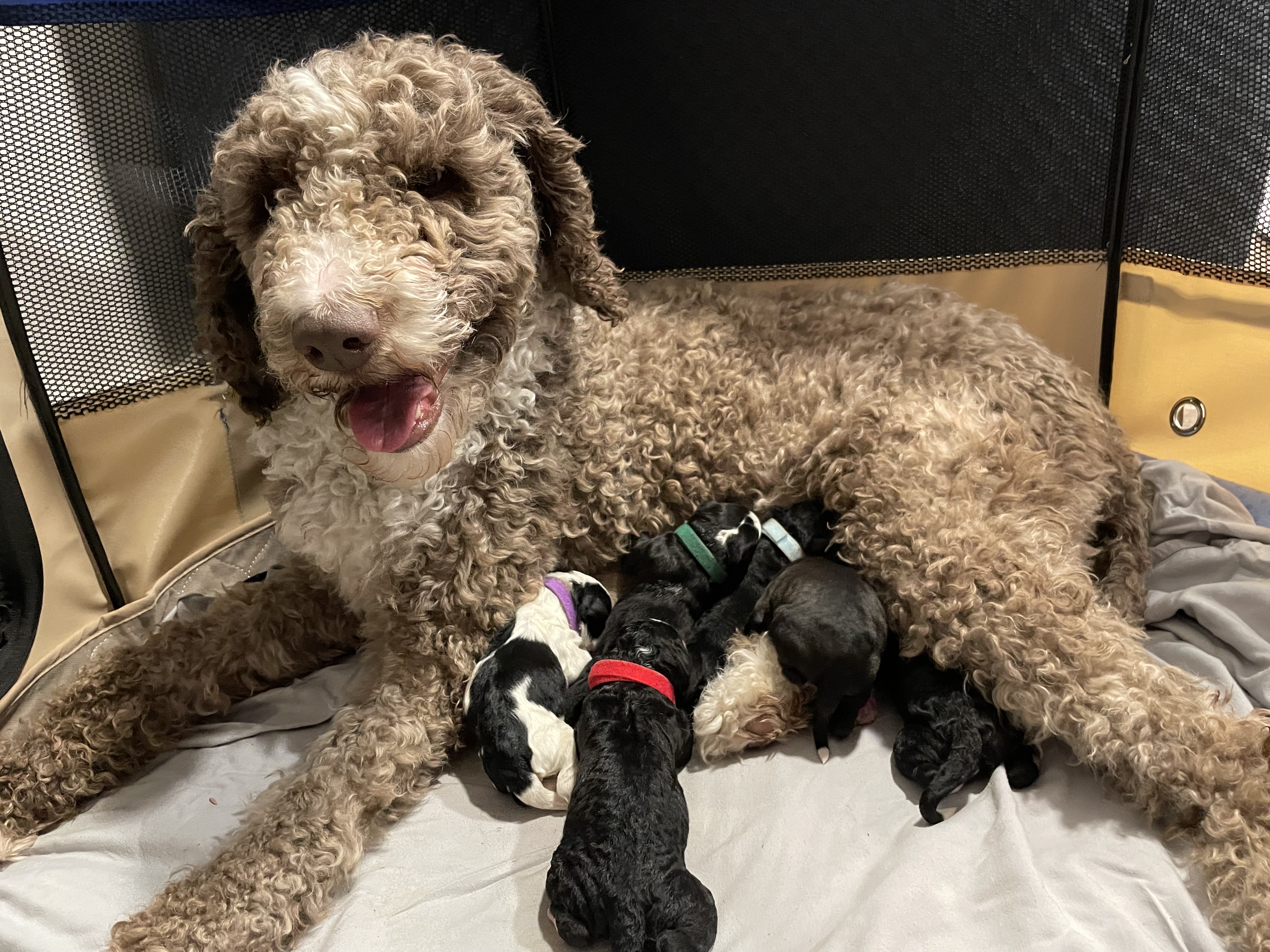 We have a litter of 7 beautiful F2B Bernedoodle (62.5% Poodle and 37.5% Bernese Mountain Dog) Puppies. 5 girls 2 boys. They'll be available to leave their mom as early as May 5th. We are currently taking $500 non-refundable deposits to secure your spot in the selection order. The deposit will go toward the cost of the puppy.