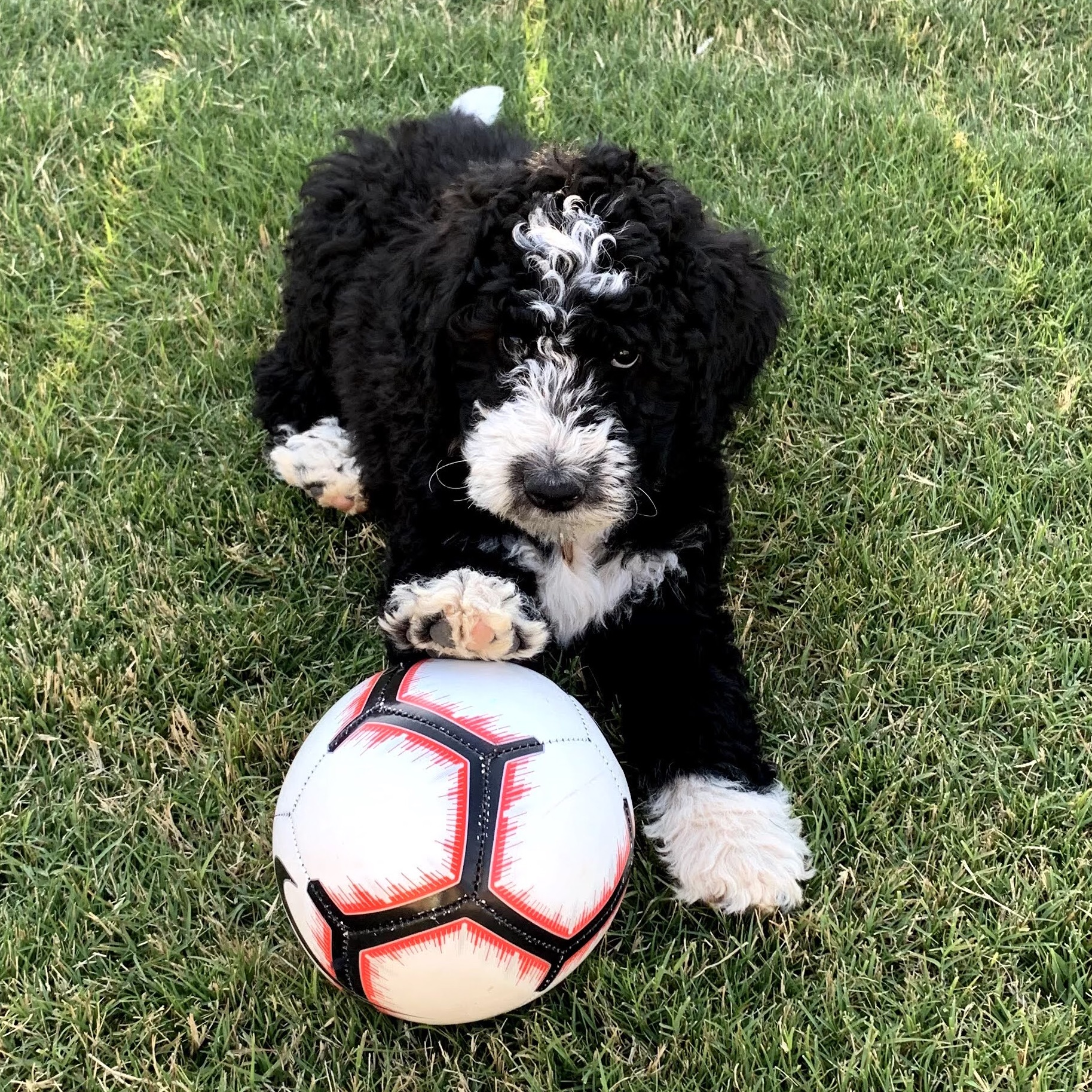 Dam: The mom is an F1B bernedoodle (75% poodle 25% Bernese Mountain Dog). She is completely non-shedding and hypoallergenic. She is so kind and gentle. She's amazing with kids, and loves to snuggle. She loves to be with us, and is always by our side. She is low energy, but loves to play when you want to. She is 47 pounds - on the smaller end for bernedoodles.
